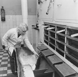 produkcja czekolady w Dolnośląskich Zakładach Przemysłu Cukierniczego "Śnieżka" (dziś Śnieżka-Invest Sp. z o.o.) przy ul. Henryka Sienkiewicza 36 w Świebodzicach; przy pracy Krystyna Kabat (kierowniczka działu produkcji czekolady), Stanisława Mikołajczyk i Zyta Cieciuch