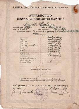 świadectwo szkolne Czesławy Łagódki, ur. w Rogożewie w pow. rawickim, od 01.04.1945 r. do 14.07.1945 r. uczennicy pierwszej klasy w Państwowym Liceum i Gimnazjum w Rawiczu ówczesne woj. poznańskie - dziś woj. wielkopolskie