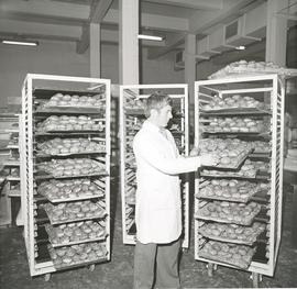 Tłusty Czwartek w ciastkarni "Plon" przy ul. Księcia Witolda we Wrocławiu. N/z: Krystyna Bielska z ciastkarni "Plon" prezentuje jeszcze ciepłe pączki
