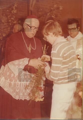 Przybycie bp Wincentego Urbana do kościoła pw. św. Wojciecha, (z prawej) o. Mateusz Bogucki