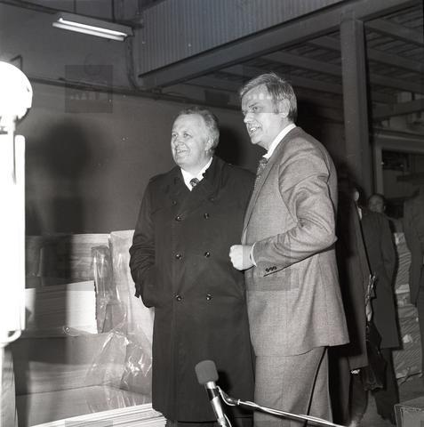 N/z delegacja partyjna w hali produkcyjnej Polaru. Po prawej dyrektor zakładu Karol Popiel, po lewej sekretarz KC PZPR Stefan Olszowski.