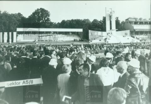 [Zdjęcie przedstawia tłumy opuszczające wrocławski hipodrom po mszy odprawionej przez Papieża.]
