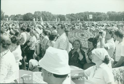 [Zdjęcie przedstawia tłumy z transparentami na mszy odprawianej przez Papieża na wrocławskim hipodromie.]