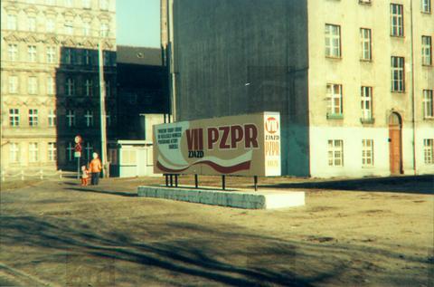 dekoracja z okazji VII Zjazdu PZPR [Warszawa, 8-12.12.1975 r.] w niezidentyfikowanym miejscu we wrocławskiej dzielnicy Śródmieście [fotografia wykonana na zlecenie Komitetu Dzielnicowego PZPR Wrocław-Śródmieście];