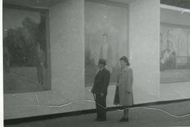 Waleria Falkowska i Władysław Falkowski (zwróceni w stronę obiektywu) przed obrazami na szkle na dziedzińcu przed Halą Ludową [dziś: Hala Stulecia];
