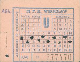 bilet miesięczny uprawniający do korzystania z autobusów Przedsiębiorstwa Państwowej Komunikacji Samochodowej we Wrocławiu, zakupiony w Polskim Biurze Podróży "Orbis" tamże