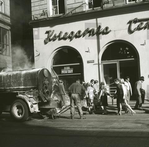 N/z mężczyzna wylewający smołę z cysterny do taczki.