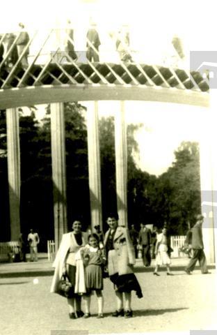 Genowefa Lindemann, Róża Lindemann i Waleria Falkowska na dziedzińcu przed Halą Ludową [dziś: Hala Stulecia] pod mostem łączącym Pawilon Przemysłowy [dziś: restauracja "Pergola"] z Pawilonem Prostokątnym [mieszczącym dział "Rolnictwo i Wyżywienie"; dziś: Wytwórnia Filmów Fabularnych] symbolizującym jedność robotniczo-chłopską;