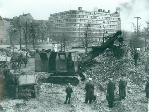 Wywóz gruzu z zniszczonych budynków przy pl. Tadeusza Kościuszki przed budową Kościuszkowskiej Dzielnicy Mieszkaniowej, w tle PDT (do lat 90. XX w. największy obiekt handlowy w Polsce,).