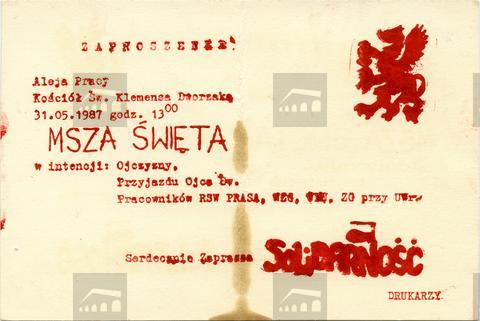 Zaproszenie / Aleja Pracy Kościół Św. Klemensa Dworzaka 31.05.1987 godz. 13:00 / Msza Święta w intencji: Ojczyzny, Przyjzadu Ojca Św., Pracowników RSW Prasa, WZG, WDN, ZG przy UWr / Serdecznie zaprasza Solidarność Drukarzy rysunek gryfa RSW Prasa - Robotnicza Spółdzielnia Wydawnicza "Prasa-Książka-Ruch" ("RSW Prasa" - nazwa potoczna)WZG - Wrocławskie Zakłady GraficzneWDN - Wrocławska Drukarnia NaukowaZG przy UWr - Zakłady Graficzne przy Uniwersytecie Wrocławskim