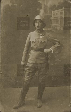 Zdjęcie w atelier fotograficznym żołnierza w mundurze polowym austriackim, najpewniej ppor. Jan Zaleski ze 106. Sturmbaon, w hełmie stalowym M17, rękawicach skórzanych, ze szpicrutą i kordem, odznaczonego dwoma medalami; na odwrocie podpis i adres Jan Zaleski Lt / 16/6 1918 / Szanowny Janusz Zaleski / profesor gimnazjum Stryj / c k. gimnazjum / Galicja / ... Zaleski ... Sturmbaon 106) Feldp... 296